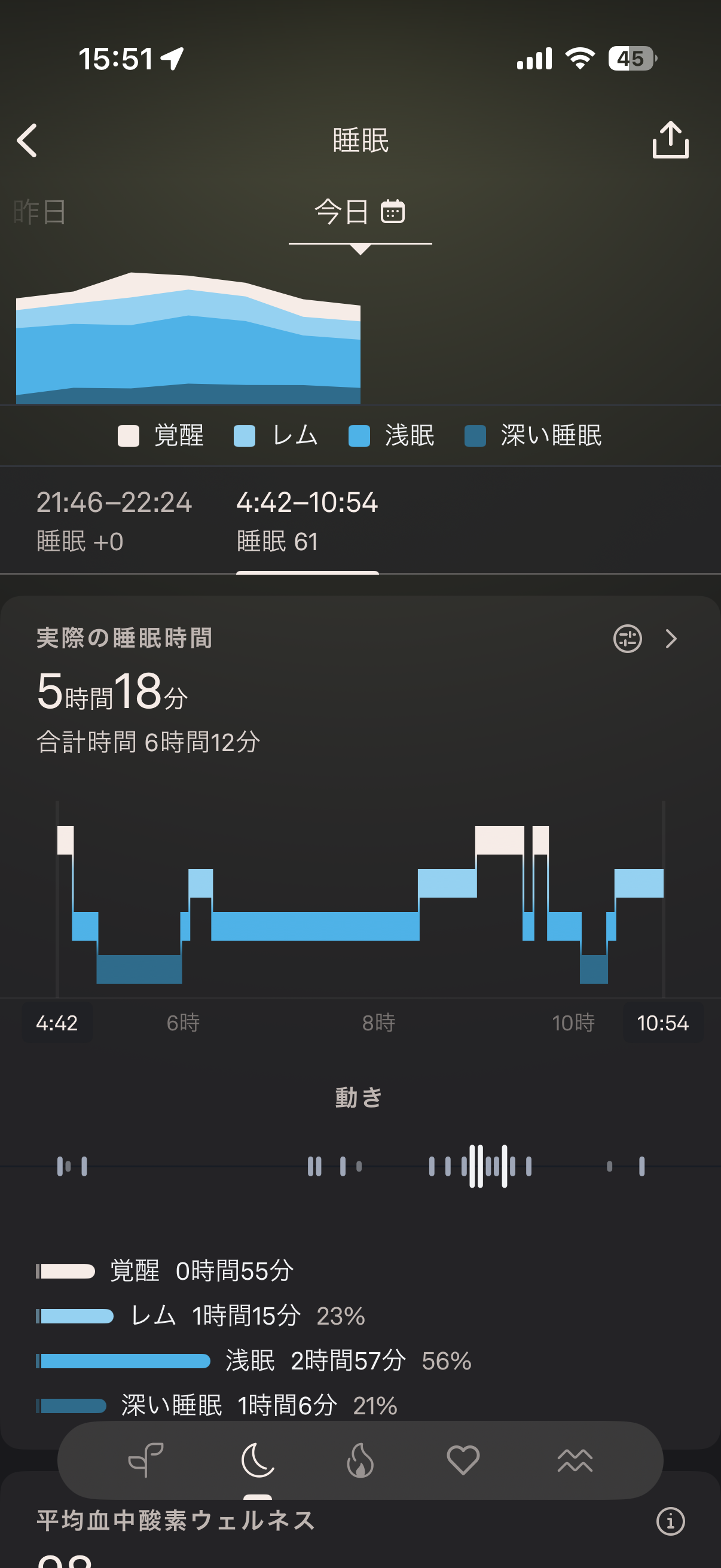 • 浅睡眠:56%(やや多いが許容)