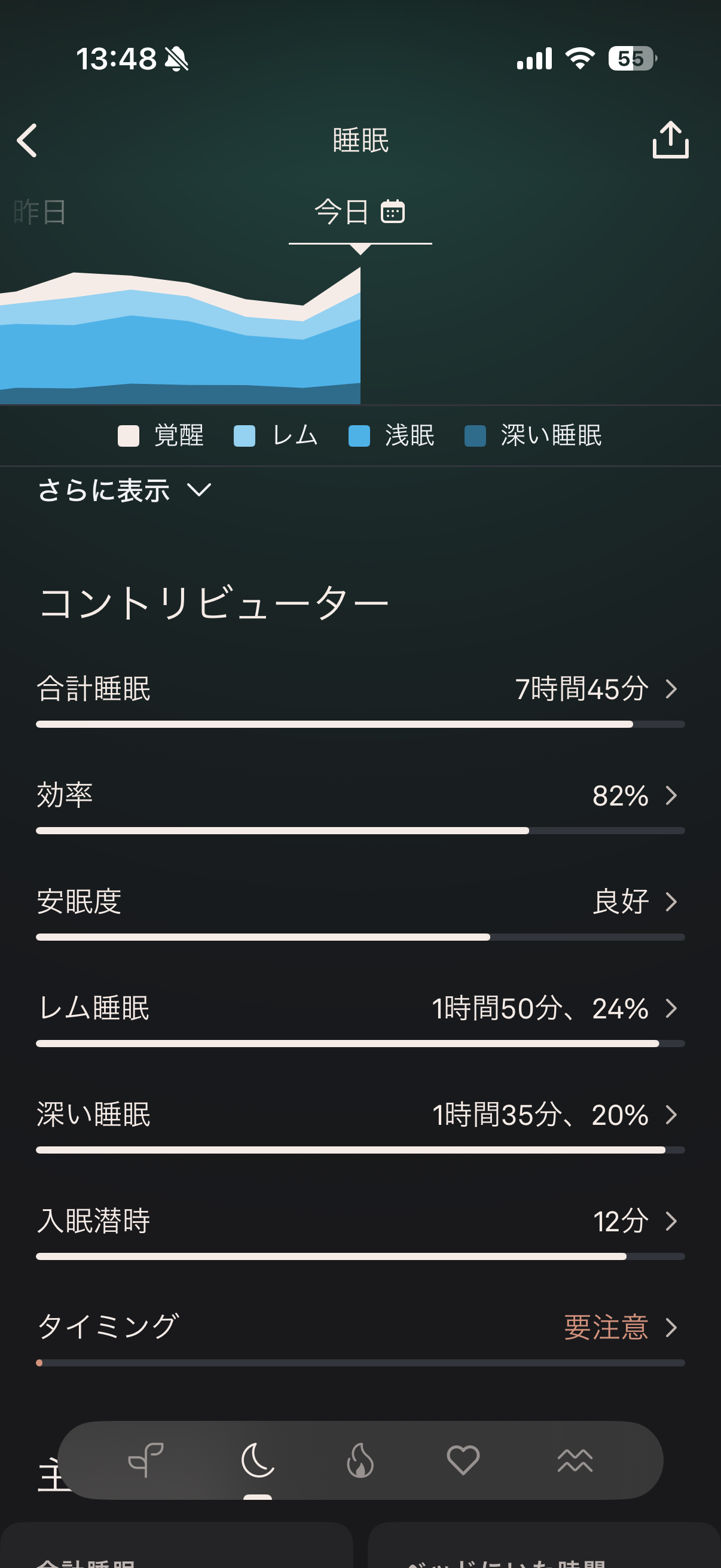 • 総睡眠7時間38分:量は問題なし。