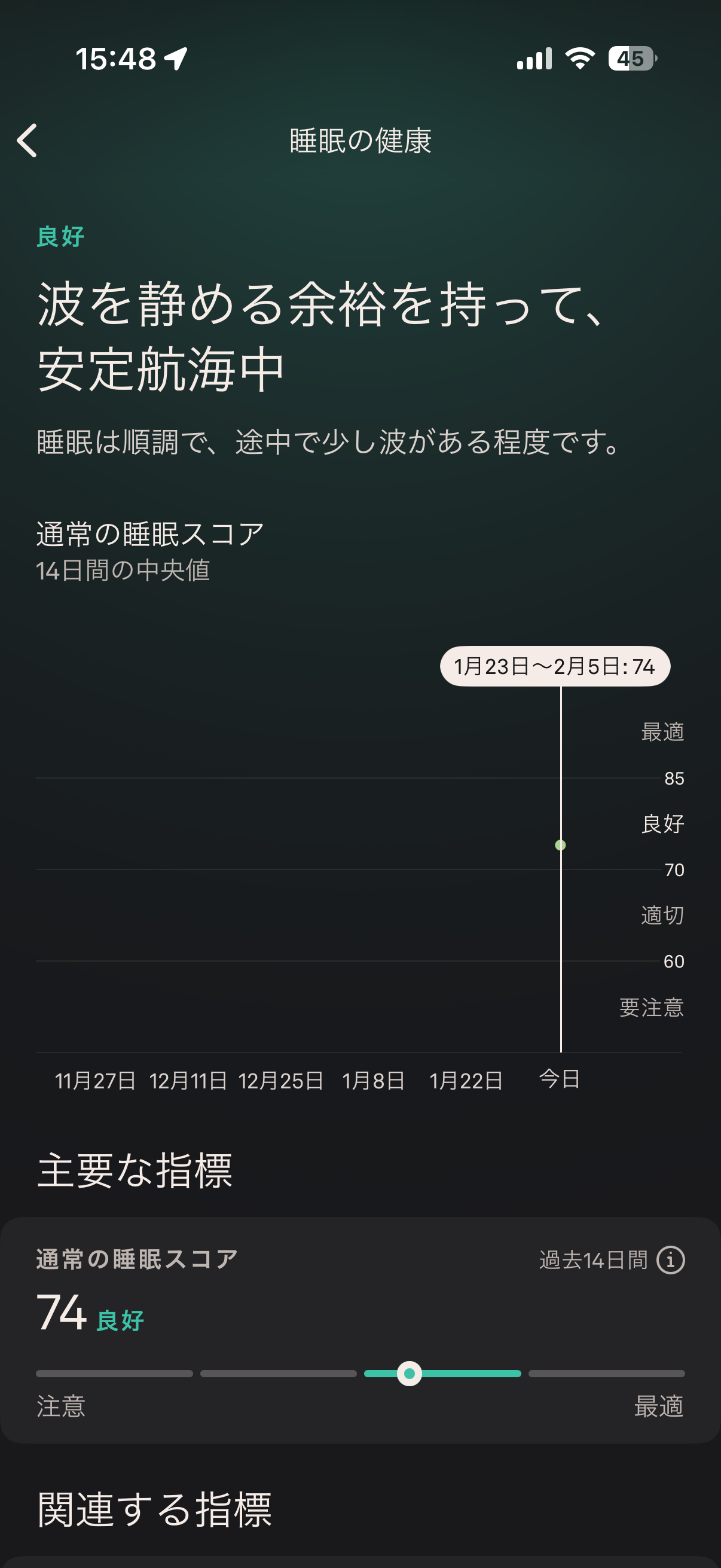 睡眠段階が取れていて、心拍・HRVも良いので、スコアが「良好」なのは数字の並びとして自然。
